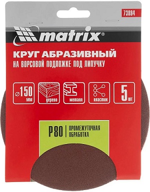 Круг абразивный на ворсовой подложке под "липучку", P 80, 125 мм, 1/5 шт.// Matrix